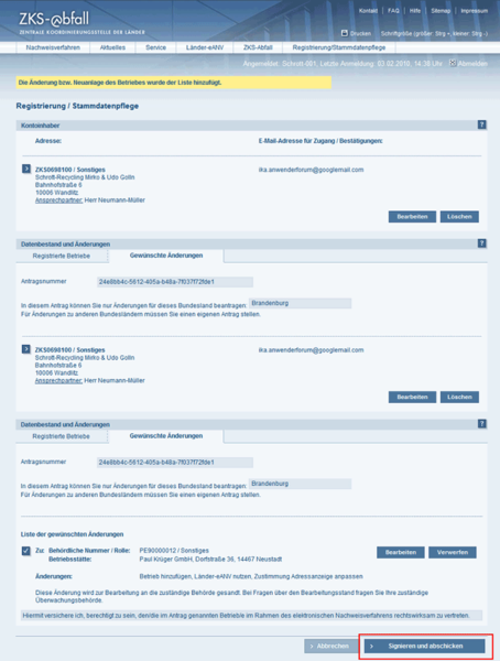 Nach dem Login erscheint die Maske "Registrierung/Stammdatenpflege". Es werden der Kontoinhaber und bereits unter diesem Konto angelegte Betriebe angezeigt (es handelt sich in der Abbildung um fiktive Daten). Durch Anklicken der Schaltfläche „ Betrieb hinzufügen“ kann dem Konto ein Betrieb hinzugeführt werden.